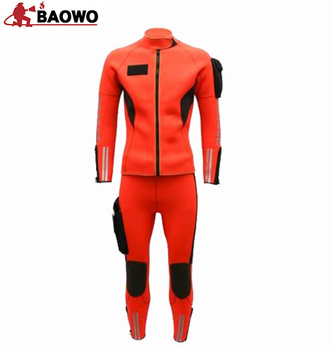 产品简介:湿式救援服是消防救援人员在抗洪抢险、水域救援等任务中,入水救援的全身防护装备,主要用于防止涉水救援时体温散失过快,造成失温。同时还可以降低身体被水底礁石、砂砾,割伤以及水母海葵等生物的攻击风险。结构参数:主要材质为3mm带有钛涂层的氯丁橡胶材质,并由氯丁橡胶材料拼接,不含甲醛,采用发射钛涂层保持热量。可