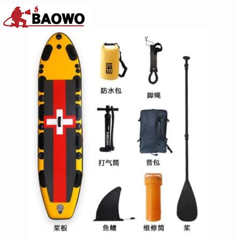 一种可用于救援的充气桨板,包括方向控制装置,充气装置,移动装置,桨板本体和救援品放置箱,所述方向控制装置插拔设于桨板本体上,所述充气装置设于桨板本体上,所述移动装置设于桨板本体上,所述救援品放置箱设于桨板本体上且设于充气装置同侧,所述方向控制装置设于救援品放置箱的同侧,所述充气装置设于救援品放置箱和方向控制装置之间,所述充气装置可以为救援品和桨板充气.本实用属于充气桨板技术领域,具体是一种可用于救援的充气桨板,通过设置救援用品存放箱使不同的充气救援产品被带到海面上进行救助伤员,同时通过在充气桨板上设置充气装置,使救援物品与充气桨板均可随时被充气使用,方便快捷,且操作简单.