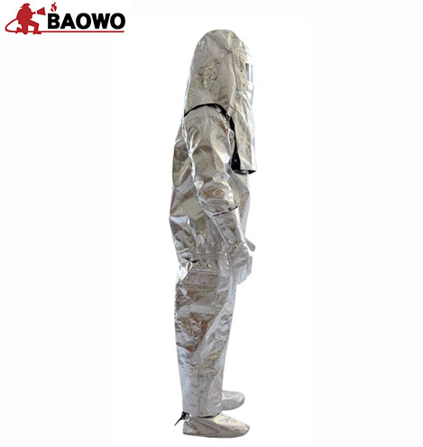 消防员避火服是消防员进入火场内扑救恶性火灾和抢险救援时穿着的防护服装,是消防员特种防护装备之一。该服装具有良好的耐火焰、隔热性能,并具有材质轻、柔软性佳等优点。该服装不仅适用于消防员在火场的火焰区进行灭火战斗和抢险救援,也可适用于玻璃、水泥、陶瓷等行业中的高温抢修时穿着,其用途广泛,具有显著的社会效益。穿着该避火防护服,可抵御1000℃的火焰及热辐射伤害,也能够有效防护高温水蒸汽的喷溅,该产品适合近火源使用,但不适合进入或穿越火源。外覆铝质保护层,全身式防护,服装前部拉链带有保护装置,头罩为镀金(铬)面窗,内置安全头盔,带呼吸器背囊。可以配合正压式呼吸器使用,整体产品采用连体式结构或分体式结构由头罩、上衣、裤子、靴子、手套等防护部件组成。