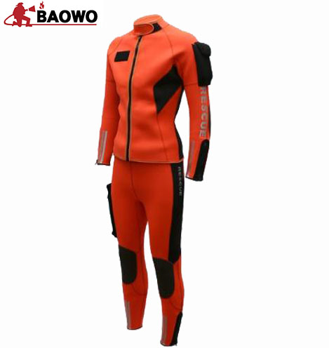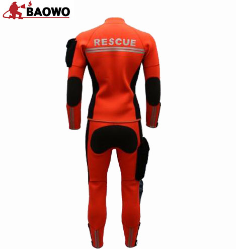 产品简介:湿式救援服是消防救援人员在抗洪抢险、水域救援等任务中,入水救援的全身防护装备,主要用于防止涉水救援时体温散失过快,造成失温。同时还可以降低身体被水底礁石、砂砾,割伤以及水母海葵等生物的攻击风险。结构参数:主要材质为3mm带有钛涂层的氯丁橡胶材质,并由氯丁橡胶材料拼接,不含甲醛,采用发射钛涂层保持热量。可