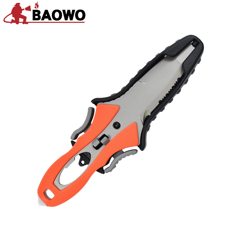 产品简介:产品名称:水域救援刀型号:BW-D1801、结构组成:由钛合金刀刃、刀鞘、刀柄部件组成。2、刀鞘和刀身保险链接,保证水下刀身和刀鞘不会轻易分离,一按式开关设计同时,紧急情况时,让刀体安全快速地拔出刀鞘槽,且方便单手操作。3、刀背设有一段开刃的锯齿,锯齿排布均匀,刃口锋利,可快速锯断树木、缠绕的网具、绳索、水草等