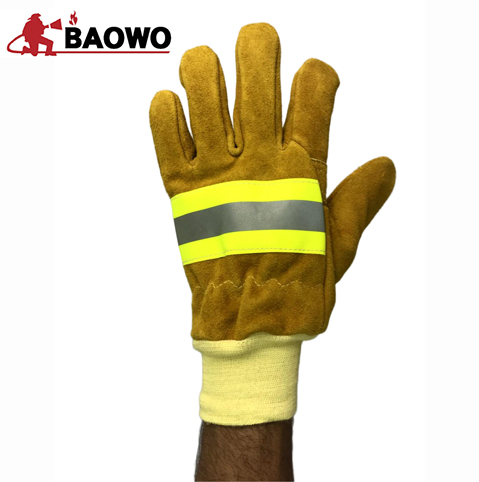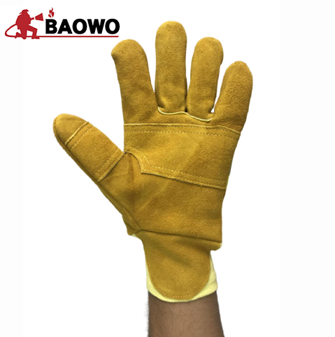 材料组合:采用黄色绒面头层牛 皮,内层为凯夫拉复合布,皮革厚度:羊皮厚度1.0mm。手背有反光条,凯夫拉螺纹袖口和缝纫线。